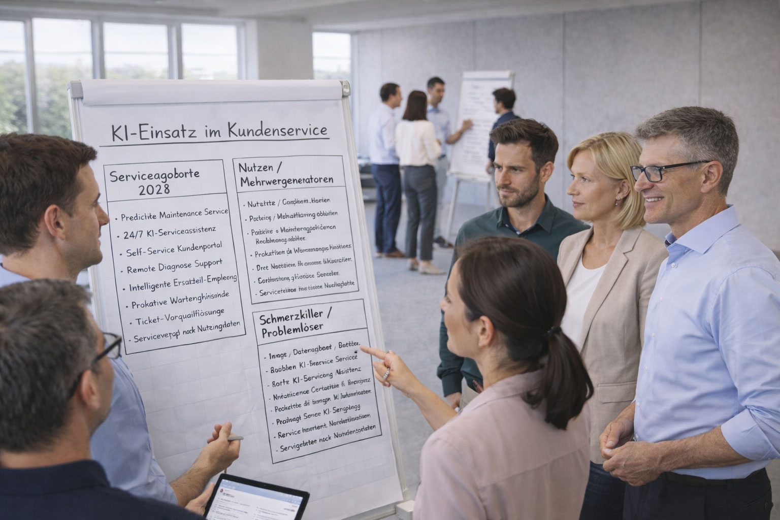 Mindestens: Geschäftsführung mittelständischer Unternehmen/BU-Leitung, Vertrieb, Service und jemand aus Produkt/Entwicklung oder Operations. Markt- und Umsetzungsblick müssen am Tisch sein – sonst werden Varianten entweder theoretisch oder operativ nicht machbar. IT ist idealerweise ebenfalls vertreten.