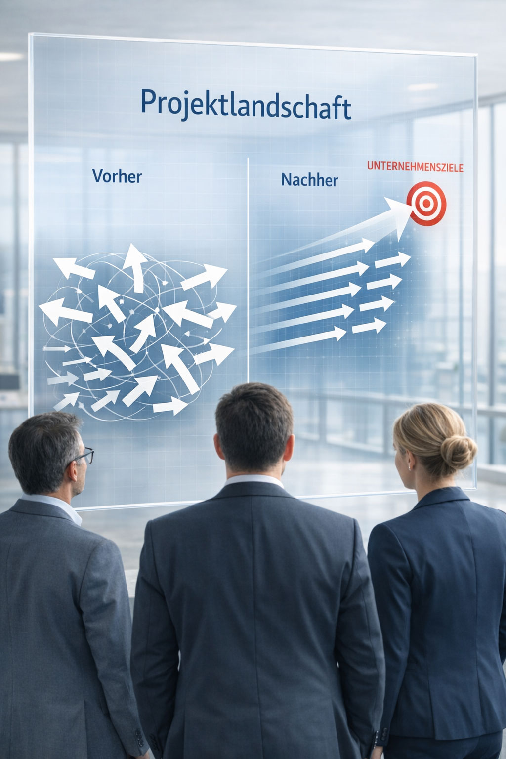 Wir klären, ob bei Ihnen Portfolio-Fokus, Projektführung, Audit/Neustart oder Verankerung der Veränderung der schnellste Hebel ist.