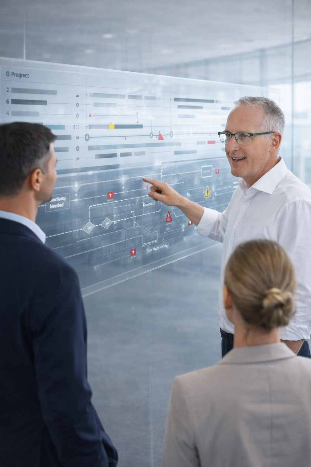 Wir setzen Governance, Rollen, Rhythmus und Steuerungslogik sauber auf und sorgen für Transparenz gegenüber Geschäftsführung und Gremien. KI nutzen wir pragmatisch, z. B. für Meeting-Notizen, Status-Verdichtung und Risiko-Checks. Ergebnis ist ein stabil geführtes Vorhaben mit übergabefähigem Setup, das intern weiterlaufen kann.